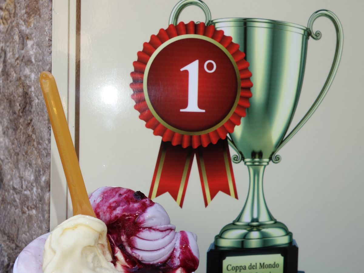 【サンジミニャーノ】ここでは自由行動でした。ジェラートコンテストで世界一に輝いたお店があります。日本語表示もあります。少し並んでゲット。やはり美味しかったです!フレーバーの種類も豊富!