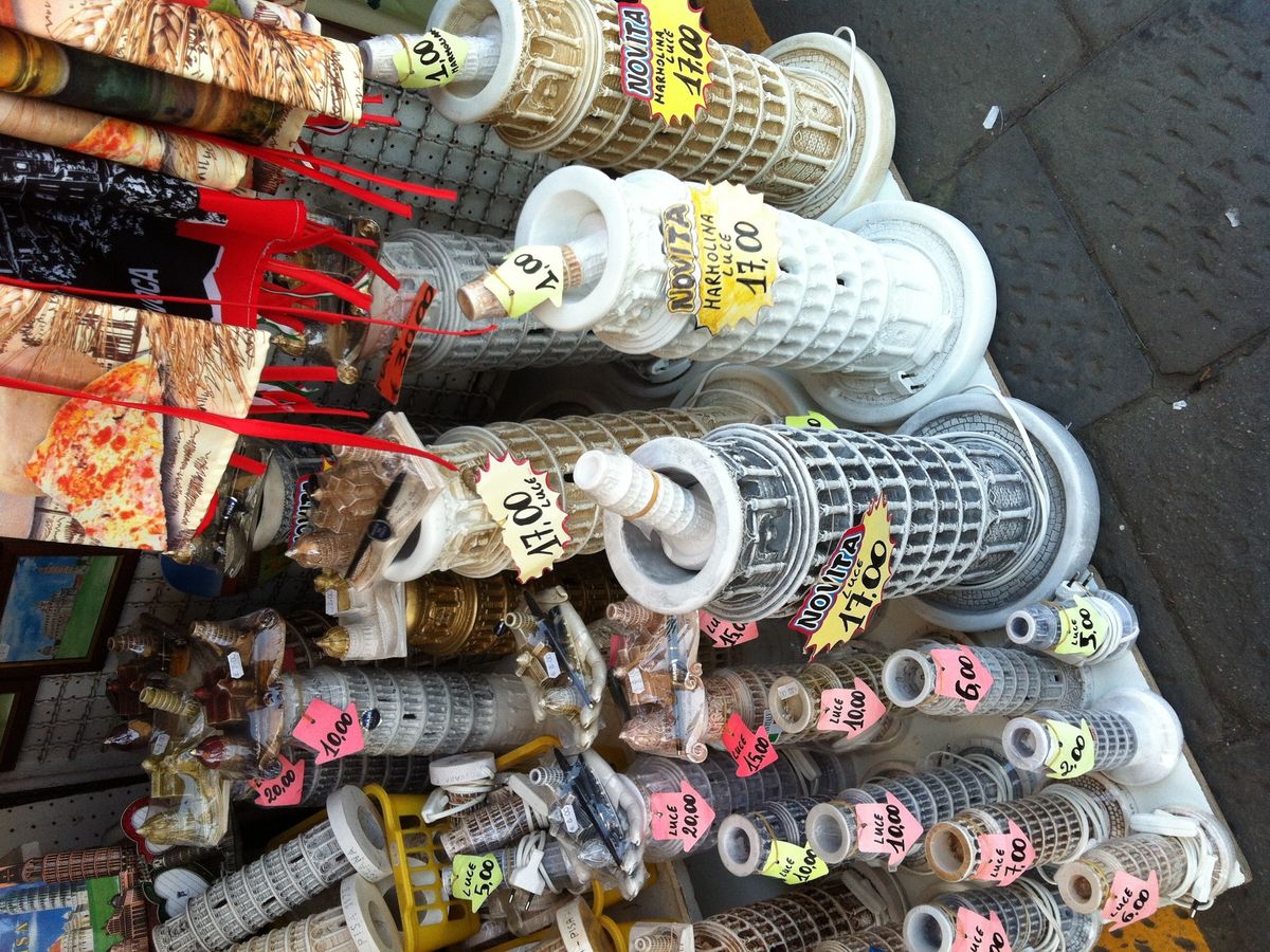斜塔の小瓶やランプ、マグカップにグラスにマグネット…観光地でぼったくりに会わないか、スリがいるのではないかとビクビクしていたのですが、意外にお値打ちに色々売っているので欲しいものがたくさんあったのですが、現金をあまり持っていなかったので泣く泣く我慢しました。