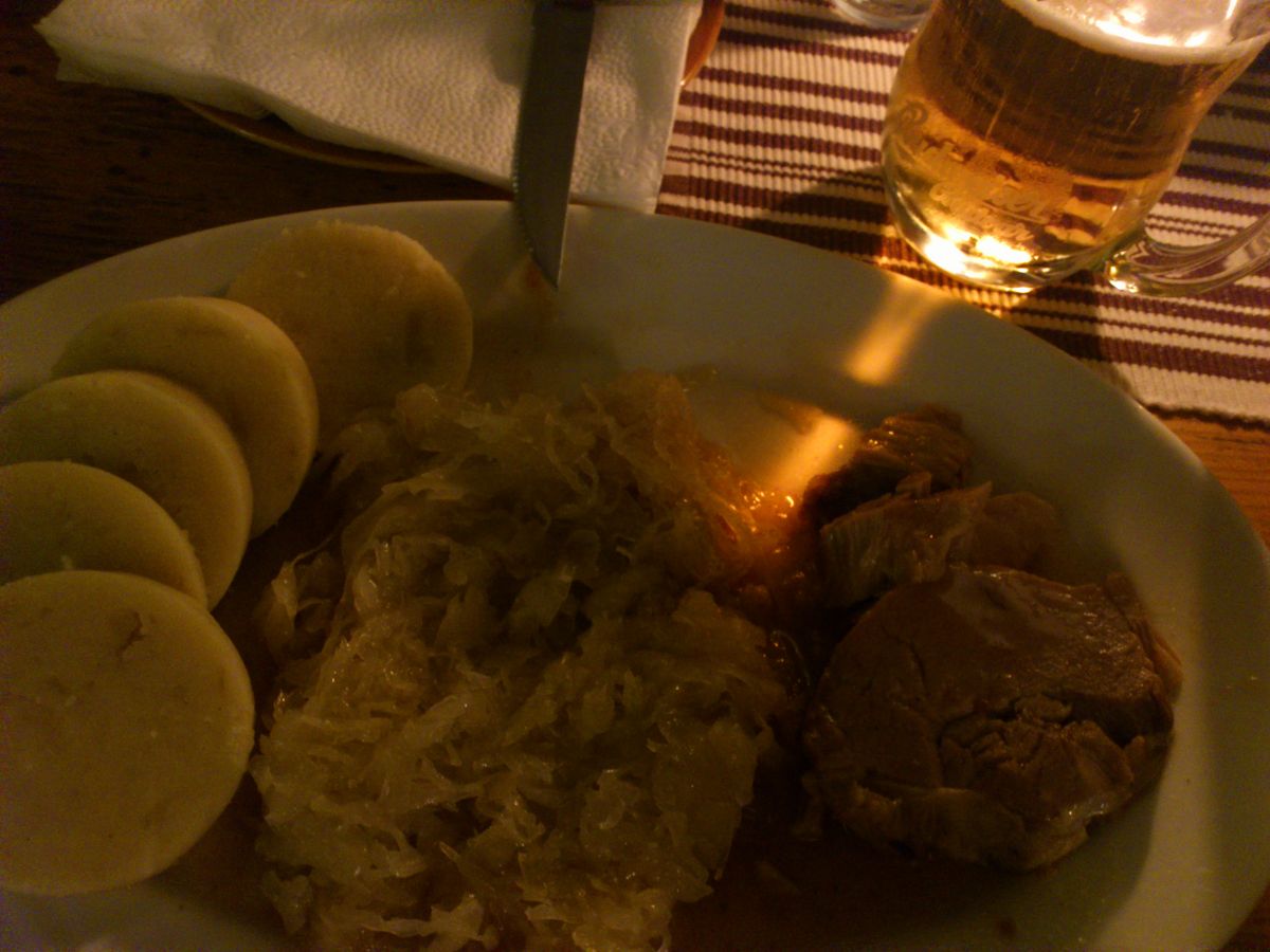 洞穴のような薄暗い人気のレストランでお昼。ガイドさんはドリンクオーダーを手伝います。別料金。バドワイザーの元祖のチェコビールにしました。豚か牛かパスタ?米?が選べていたと思います。パスタ?米?は軽めそうでしたが、あまりおいしそうに見えませんでした。自分はどのガイドブックにも載っているド直球の伝統料理の豚肉で。豚肉がとても柔らかく煮てありました。かかっているソースはまろやかでしたが、おなかいっぱいのときにあの匂いを嗅ぐと苦しくなりそうな濃い味です。つけあわせの酢キャベツとお団子は初体験でしたが見た目より量が多く、頑張って完食。一度食べればもういいかな。