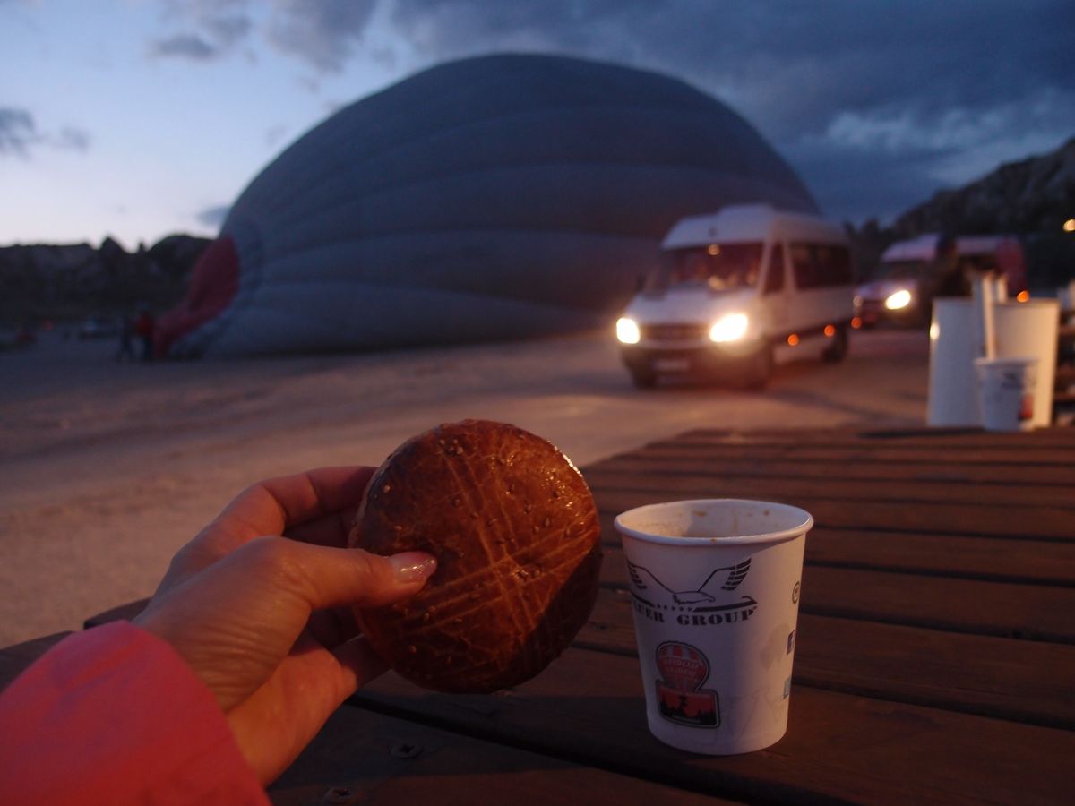 真っ暗な中に現地に到着し、ウエルカムドリンクとパンを頂きながら、バルーンが膨らんでいく様子を見ていると、あれが私が乗るバルーン何だと、何だかワクワクしてきます。