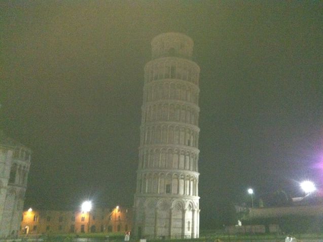 途中ハプニングがありました。サン・ジミジャーノを出発する時間(15:15)になっても、バス&ガイドが待ち合わせ場所に来ず、1時間以上待ちました。参加者カップル(アジア系)がiPhoneを紛失し、(盗難として)警察沙汰になった為でした。ツアー参加者全員の手荷物を調べられることになり、結局、iPhoneは見つからず、2時間以上遅れて、ピサに向かいました。ガイドさん(♀)は、責任を感じて、泣き出してしまいましたが、参加者の多くは、ハプニングを面白がる余裕もあり、ガイドさんを慰めたり、取り調べの様子を動画で撮ったり、楽しんでいました。ピサ着は夜になりましたが、暗い中に浮き上がってみえた斜塔がとても幽玄で、却って良かったと思います。