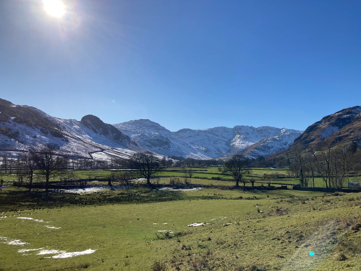 3月の積雪は湖水地方でも珍しいようでうっすら雪化粧の山々の様子と冬でも青々とした緑とのコントラストがとても綺麗でした。(ガイドも珍しいと写真を撮ってました)