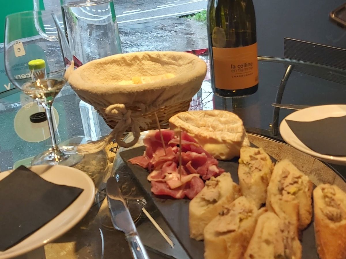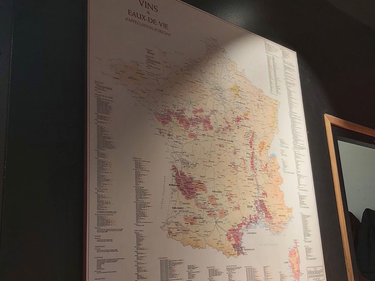 ワイン屋に着いて、おつまみの準備をしてくださっている間に、お店のお姉さん(とても若かったんですけど知識豊富)がお店の壁に貼ってある地図を使って、フランスの葡萄の産地やそこで取れるワインやワインの選び方などを詳しく教えてくれました。そうこうするうちに、お客さんが次々と来てすぐにお店の方と話をしてワインを決めているようだったので、なにを話しているのか聞いてみると、お店に入るなり「こんな料理を食べるんだけど…」とすぐに食べ物の話から始まり、値段を伝えるとお勧めをいくつかピックアップして勧めているのだとか、流石プロだな~を感心しました。(私たちもアドバイスをいただいて購入しました)