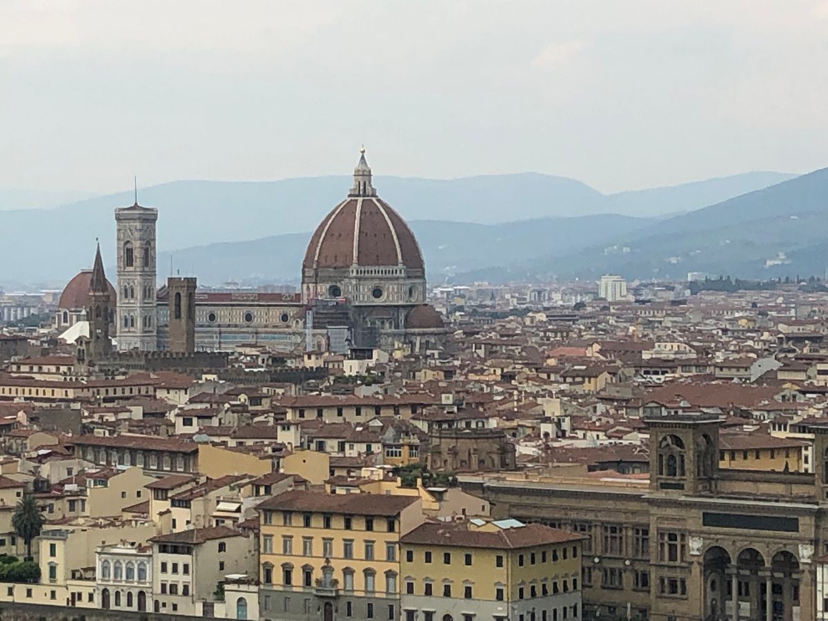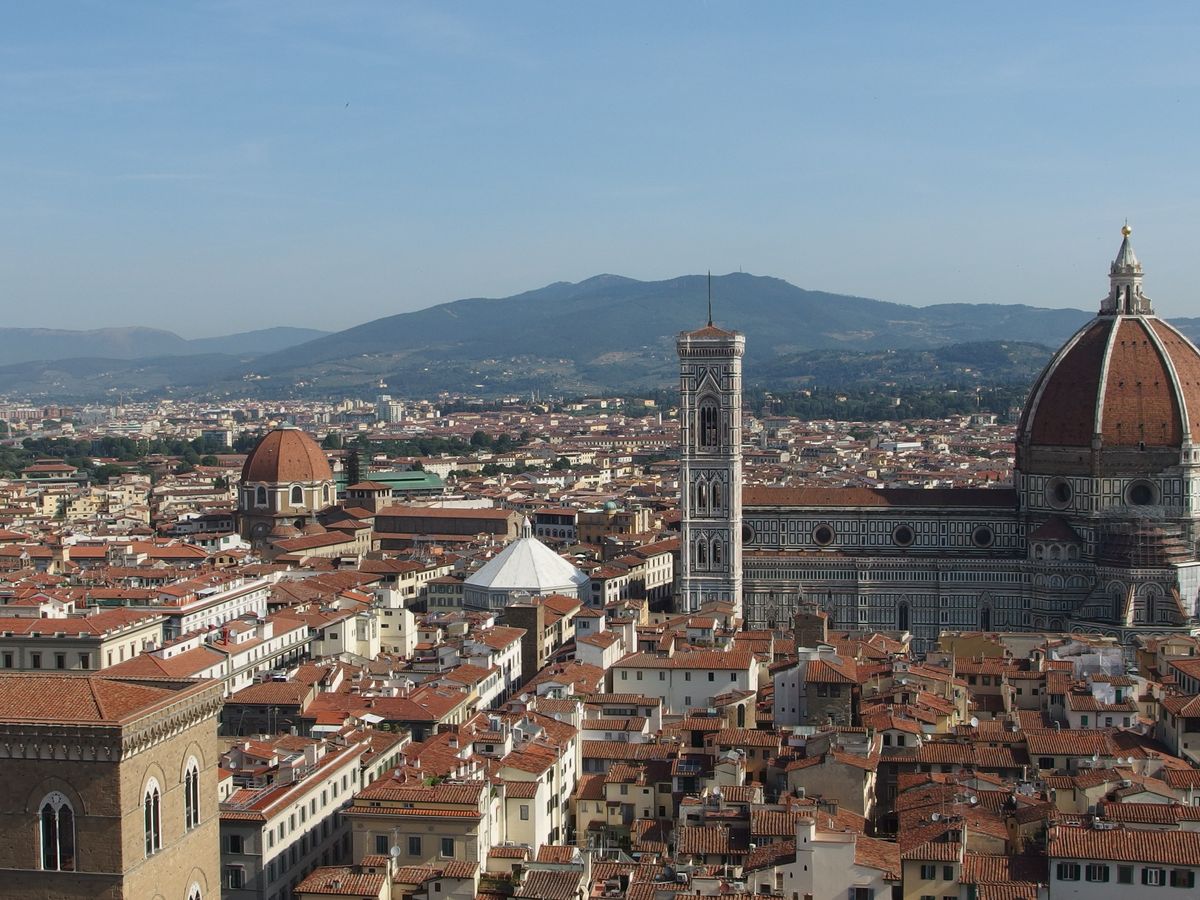 これまで登ったことのなかったアルノルフォの塔からは、(ドゥオーモのクープラよりは低いですが)快晴の下で、ドゥオーモを真横から間近に見ることが出来爽快でした。また、ヴェッキオ宮殿内美術館では、映画「インフェルノ」に出てきた、五百人広間、ダンテのデス・マスクをゆっくり鑑賞。加えて、これまで入ったことのなかった、地下のローマ時代の半円形劇場跡も見学することが出来、フィレンツェ滞在の最終日の午前中(午後はベローナに移動)の短時間でしたが、チヅさんの説明を聞きながら、ゆっくり廻ることが出来ました。