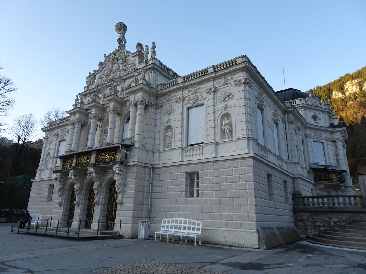 オーバーアマガウにあるルートヴィヒ2世が建設した3つの城のうち、唯一完成した城で、ロココ建築の特徴として駐車場から宮殿は見えず、しばらく歩いて行くと全体が現れます。こちらも時間指定の予約で、少し待たされました。日本語のイヤホンガイドがあり、説明がよくわかりました。小さなお城ですが、ルートヴィヒ2世はここが気に入り頻繁に滞在したとのこと、居室はとても暗いですが、装飾品が豪華絢爛ですばらしいです。使用人ができるだけ食堂に入らないようにキッチンからエレベータが設けられ、ルートヴィヒ2世はあたかもルイ14世、ルイ15世やマリーアントワネットが同席しているかの様に語りかけたりして妄想に耽ったという逸話もあります。内部は写真撮影は禁止です。お庭は噴水やマリーアントワネットなどの彫刻が点在し、素晴らしいものですが、残念ながら冬季でしたので彫刻にはカバーが掛けられ、池の水は抜かれていました。