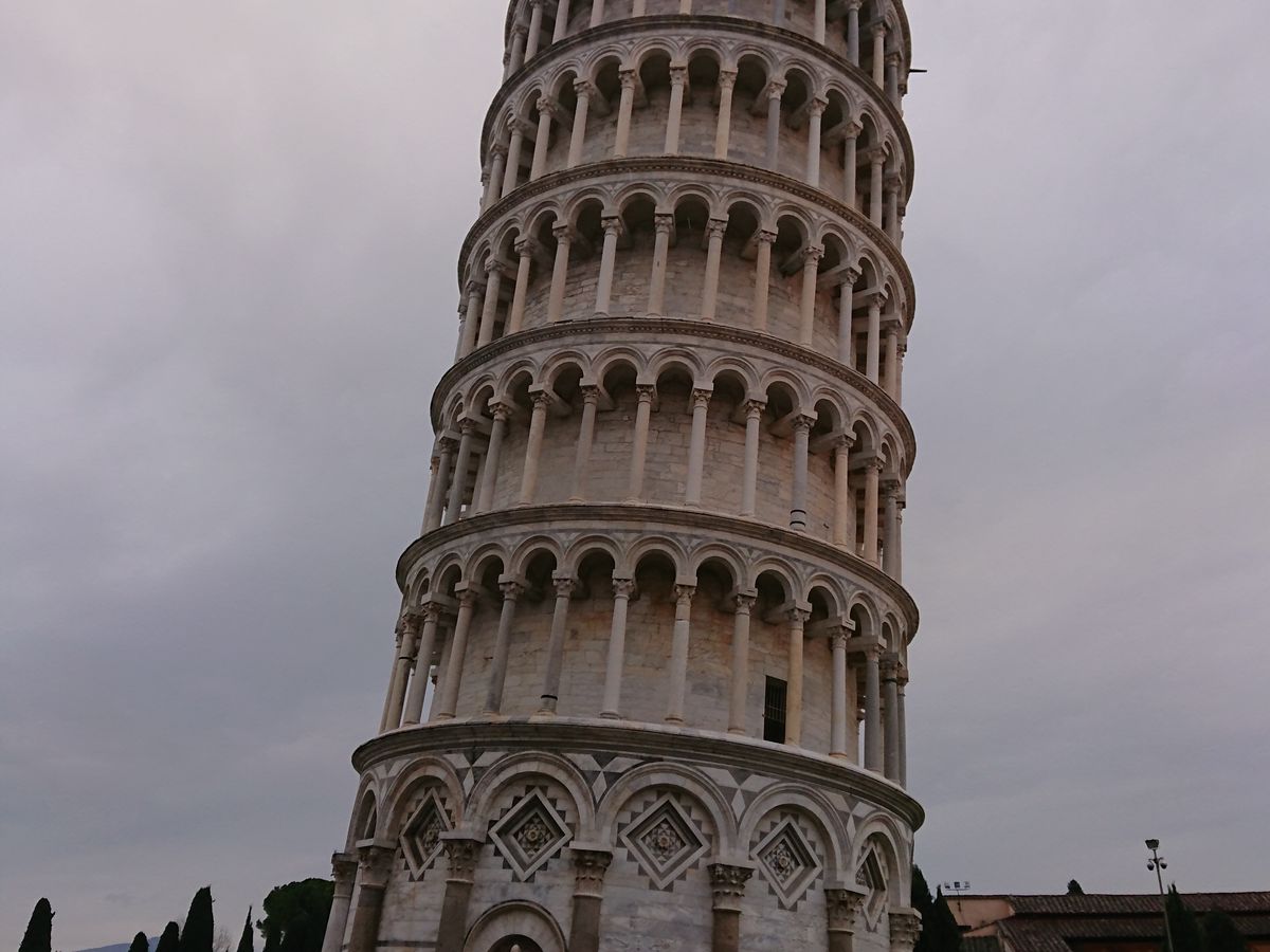 ピサの斜塔に登るとき平衡感覚がおかしくなるので、酔いやすい人は酔い止めを飲んでおいたほうがいいです。あと登るの結構しんどいです。みんなハアハアしてます。途中で休憩を何度かはさみました。後ろから人が来るのがプレッシャーになる人は途中で道を譲ったほうがいいです。階段を登りきった後の景色はとてもきれいです。ちょうど夕日と重なっていい写真が撮れました。