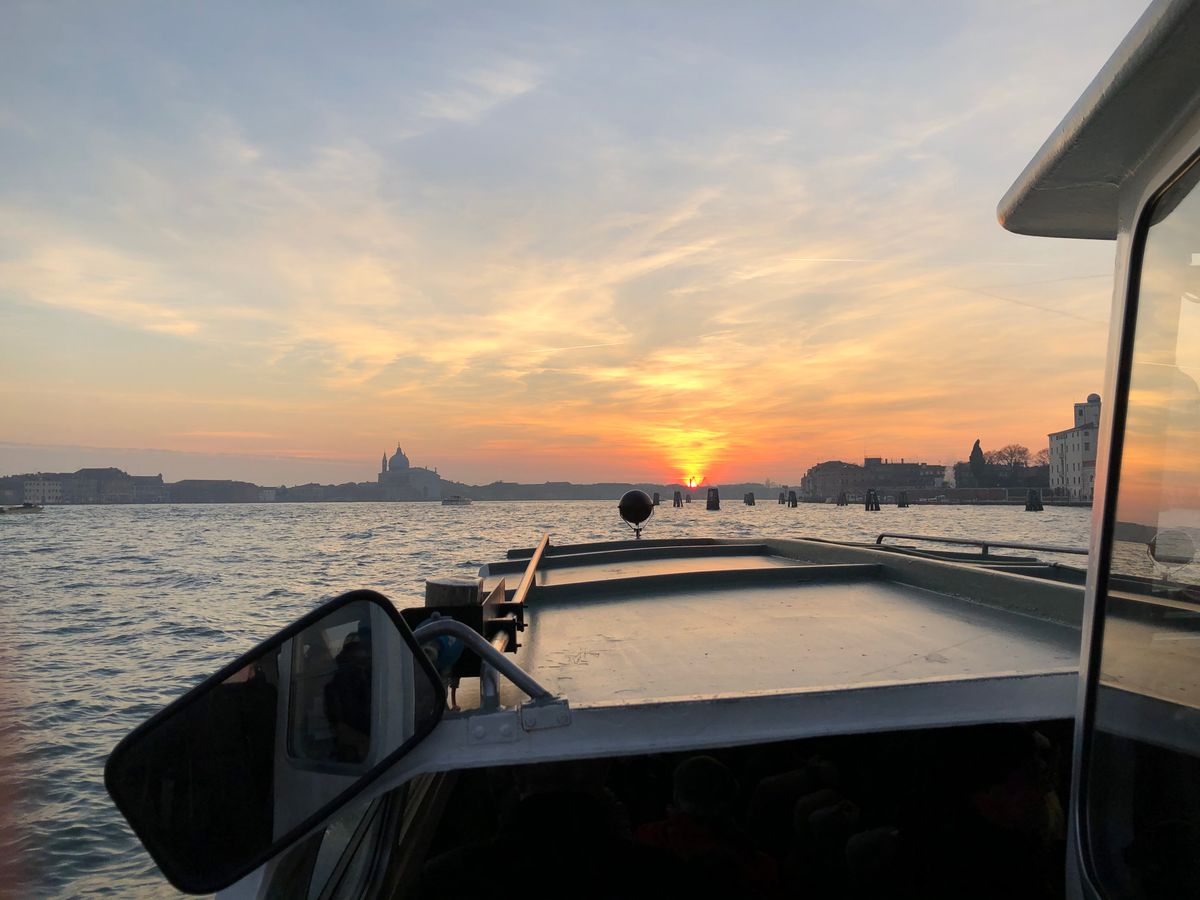 帰りに、サンマルコ広場からサンタルチア駅へ向かう水上バスで見た夕焼けが綺麗で、感動しました。
