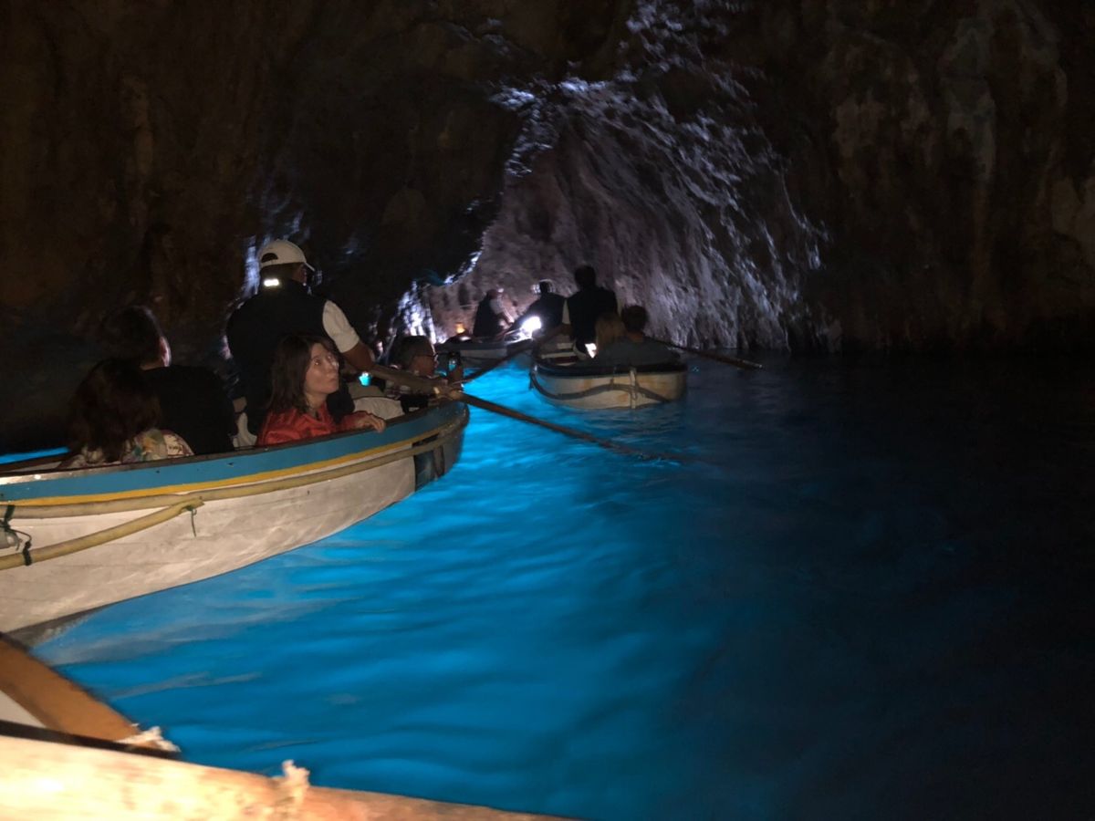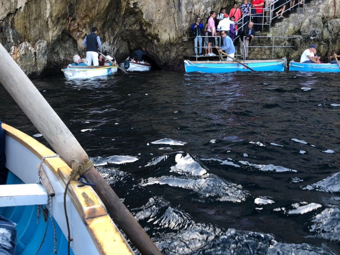 カプリ島に渡りそこからまた小さい船に乗り換えて15人前後で洞窟近くまで行きました。直前まで洞窟の中に入れるかどうかわからないとのことでした。洞窟の前には何艘もの船が待っていました。船にゆらゆら揺られなが1時間少し気持ち悪くなりました。酔い止めの薬を持ってくればよかったと後悔しました。そこからさらに1時間もう少しで吐くかも・・と思っていた時順番が回ってきました!更に小さい船に乗り換え洞窟の中へとてもキレイな青い色!!夢にまで見た「青の洞窟」でした。あっという間の短い時間でしたがいままでの人生で見たことのないキレイな青色でした。そのすぐ後のランチは気持ち悪くて食べられませんでしたがデザートのレモンヨーグルトはサッパリしてめちゃくちゃ美味しくいただきました!私たちは運良く洞窟に入れましたがすぐ後からきた船の方たちは水位が上がり入れなかったみたいです。