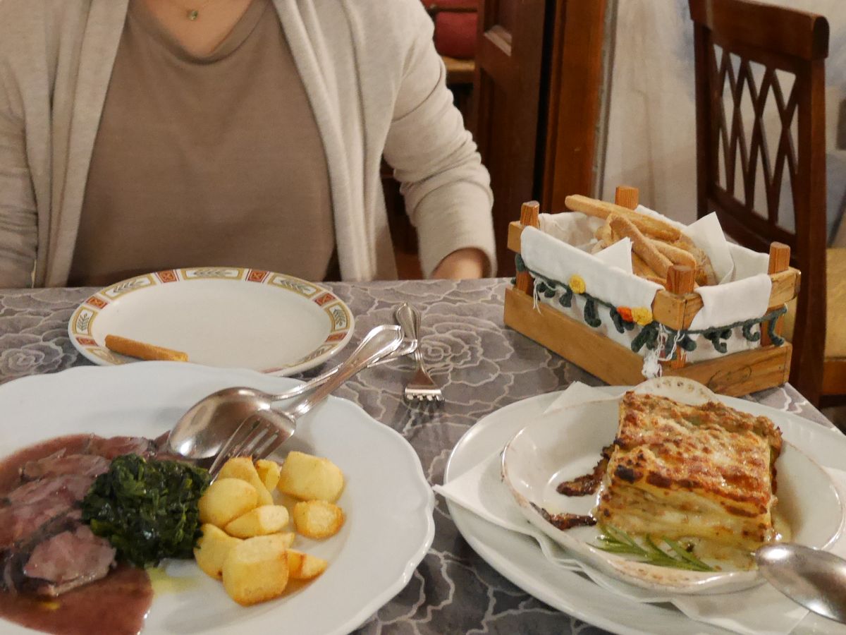 昼食はモンタルチーノの街中のレストランで食事をします。レストランは事前に市川さんのおすすめのお店を予約してくれていて、ランチのコースは20ユーロで用意もしてくれるのですが、私たちはそれほど食べられる自信もなかったのでカルトで注文。鴨料理とポルチーニの入ったラザニアをいただきましたが、これがまた美味しくて・・・。注文まで市川さんがお手伝いしてくれますので、料理の内容がよくわからなくても安心です。