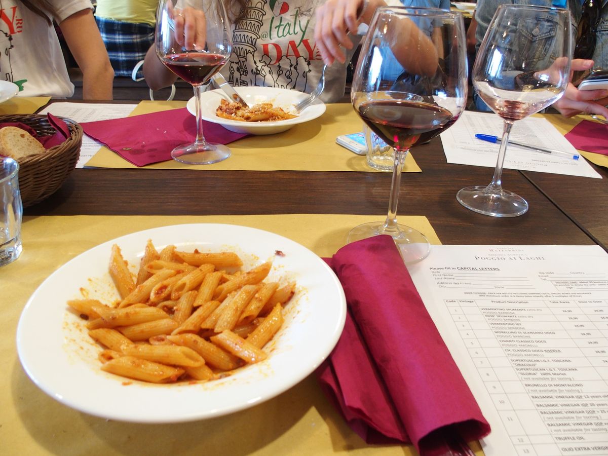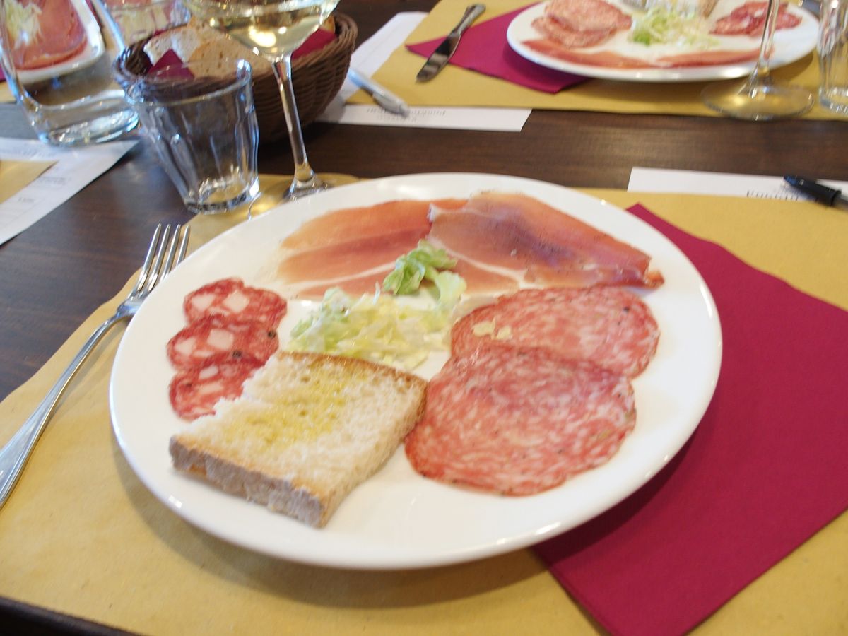 皆腹ペコで大ひんしゅく。ワイン試飲会では白、赤、ロゼワイン3種試飲できたが、量がグラス底1センチぐらいでもの足らず。お代わりも不可。ランチは前菜のハム三種とレタスが少々。これでおしまいなら暴れるところだったが、ペネがついて辛うじておなかは満ちた。この試飲会とランチの為にワイナリー滞在時間は1時間40分と長く全くのロス。寄る必要なし。サンジミニアーノ滞在は満足できたがシエナの自由時間は1時間程度と短く、ドウォーモの入場を目指す長い行列に並ぶにはかつかつであきらめた。もっとここで時間をとるべき。