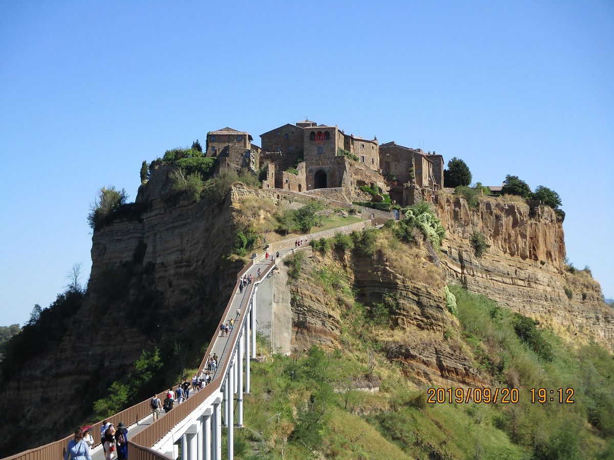 天候に恵まれ、絶好の散策日和となりました。ガイドさんの楽しいイタリア話を聞きつつ、まず、ボマルツォ怪物公園に行きました。オーガ(人食い鬼)以外にも、おもしろいオブジェがたくさんあり、撮影どころ満載で楽しめました。チヴィタでは一本道入口からの容貌に感動し、改めて来てよかったと思いました。一本道は予想以上に傾斜があり、日ごろ運動不足の方には少々きついかも知れません。村はこじんまりとしており、短時間で散策できます。オルヴィエートで有名な白ワイン、オルヴィエート クラッシコを飲みながら美味しくランチをいただきました。実際に見たドウォモは非常に美しかったです。