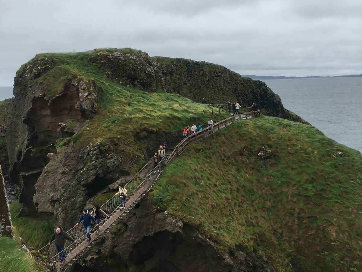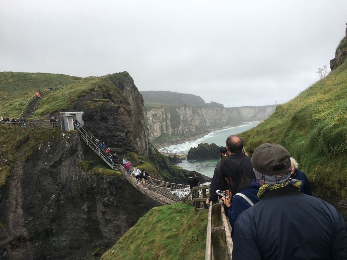 バスの中で昼食の選択をして13時頃にキャリックアリードに到着し、渡ります。20分ほど歩いて橋に。生憎の小雨と強風でしたが逆にスリル満点になりました笑