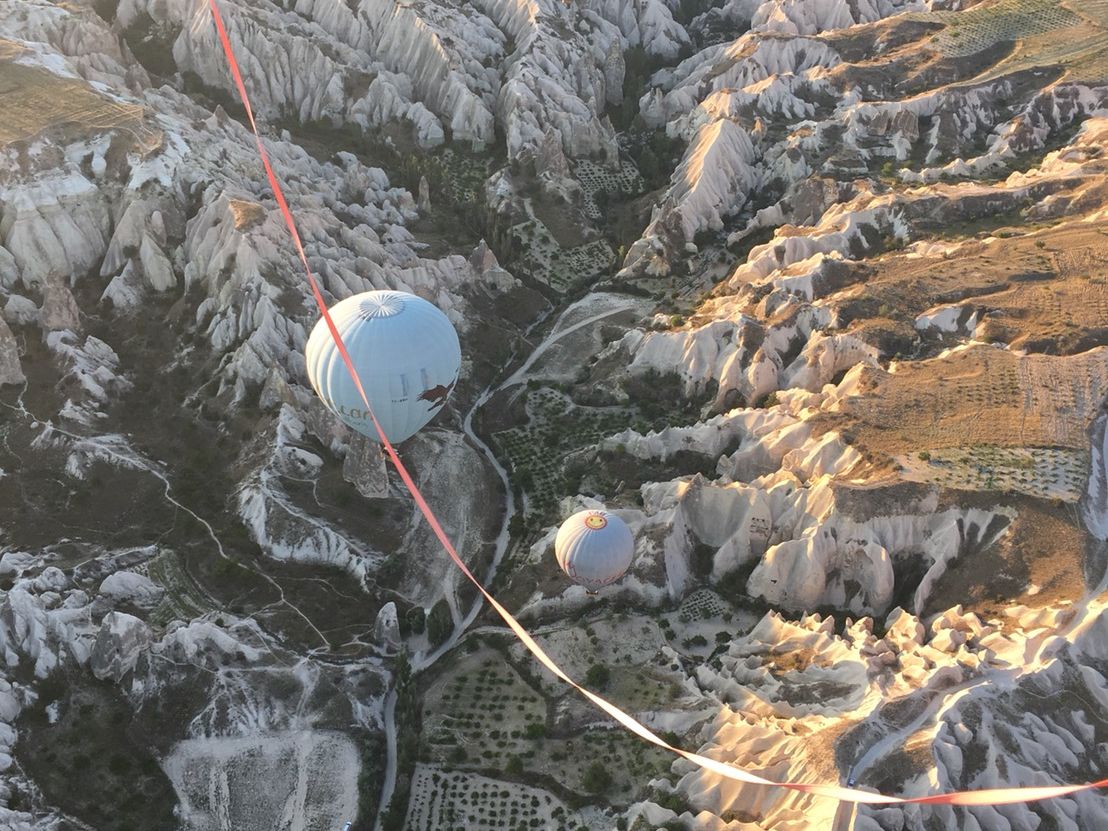高く高く上がって行く気球はいくつもありましたが、カッパドキアの谷底にもぐりその中を自由に空中散歩。この世のものとは思えないものでした。奇岩にぶつかるのではないかと思うほどスレスレに飛び今度は上へ上へと自由自在の操縦。その確かな職人技に夫と2人で最高の経験となりました。