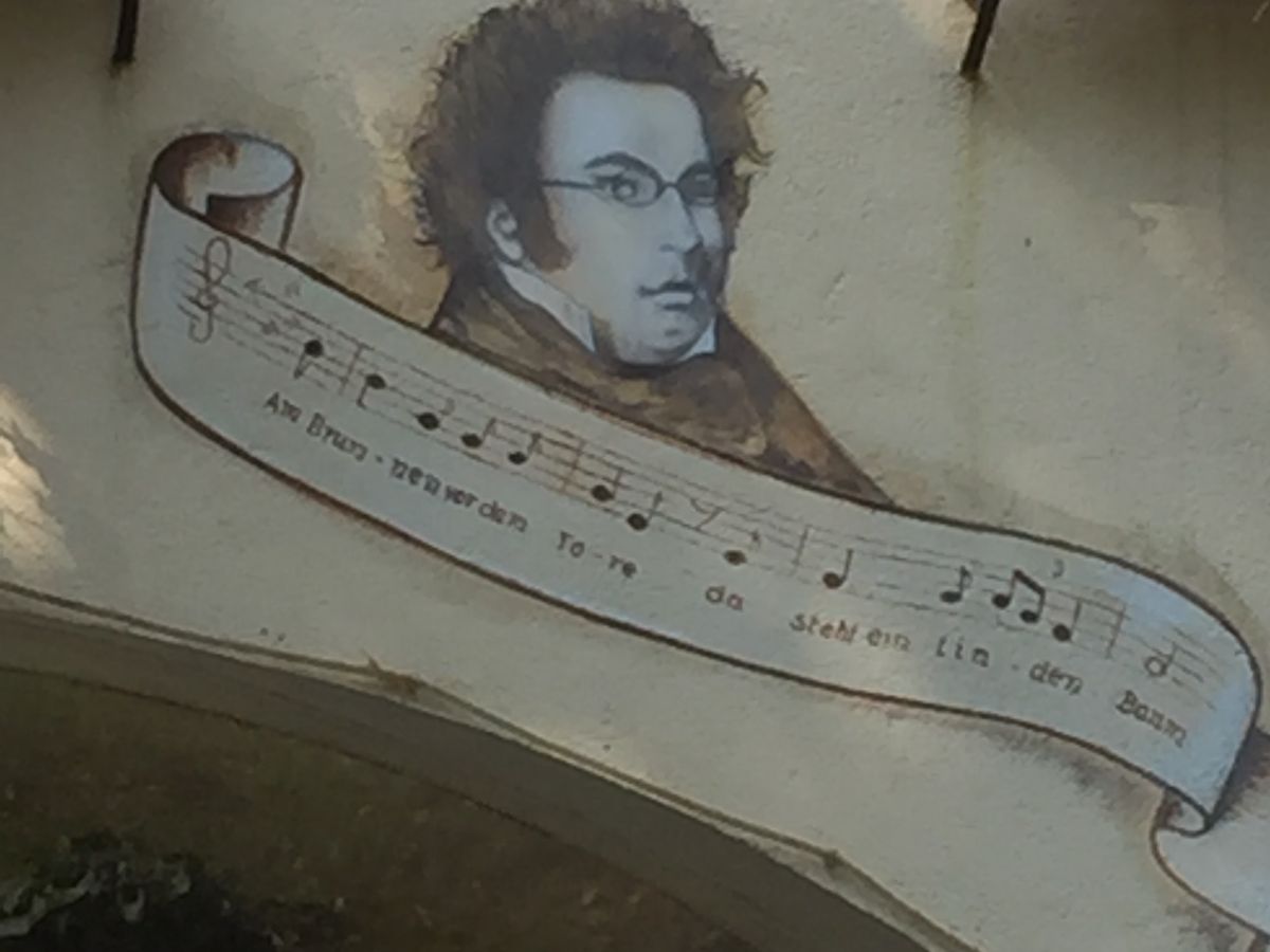 道中、シューベルトがよく訪れたレストラン「ヘルドリッヒスミューレシューベルト」に立ち寄って頂きましたが、壁面に描かれた音符と玄関前にそびえ立った菩提樹が見事に調和していました。