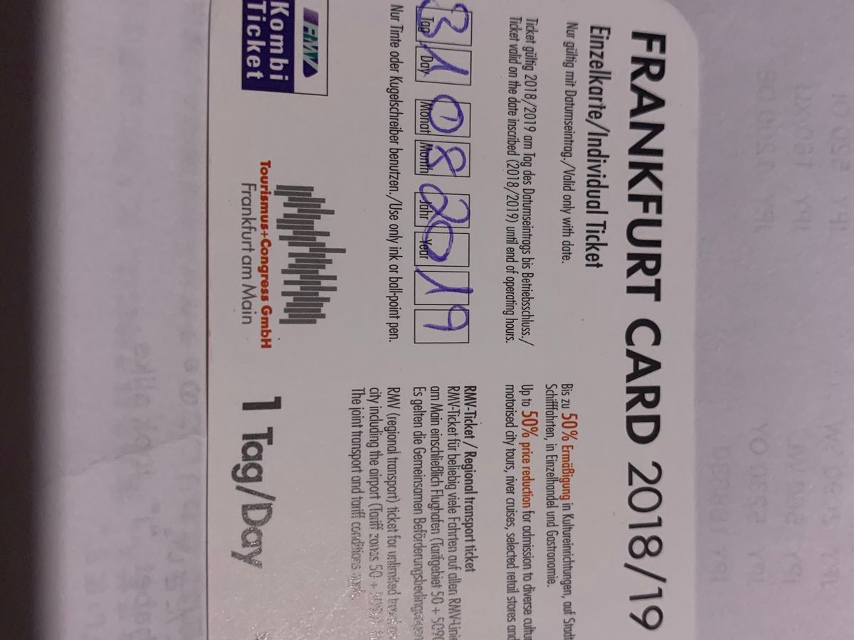 今回、空港に移動するまでの7時間に何をするか決めていなかったのとりあえず購入しましま。空港までの移動にも利用でき美術館の割引にも使えたので結果としては有意義だったと思います。私は、電車でフランクフルトに入ったので中央駅のインフォメーションで受け取りました。一番大きい出入り口の横にインフォメーションはあり受け取りも迷わずできました。