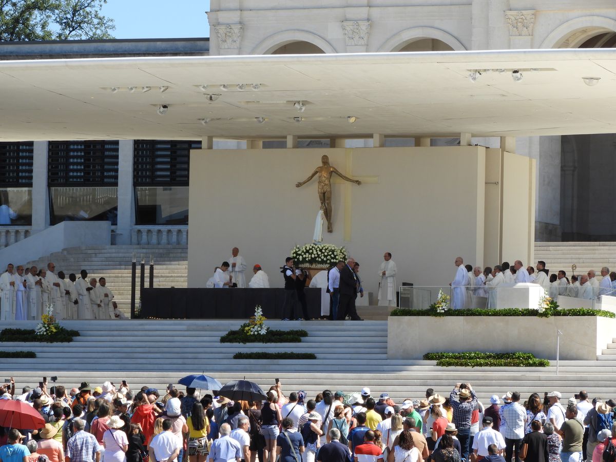約1時間、相当高速道路を飛ばしてファティマに到着しますが、まずはお土産やでトイレ休憩とコーヒーブレイクを兼ねて25分くらい停まりますので、さっさと観光すればよいのにとも思いましたが、ここはキリスト教の巡礼の地、お土産屋もよく見ると宗教的なグッズが殆どで、やはり巡礼の記念に信者の方は買っておられたようですので、それは必要な時間かも知れません。ファティマでは正午までの70分が観光の時間となりましたが、キリスト教に興味があれば見どころは多く、ちょうど屋外で大規模なミサも行われていましたので、興味深く見ることができました。ただ、ミサの関係で大聖堂の中に入れませんでしたし、ご出現の聖堂にはミサに集まった余りの人で近づけなかったのは残念。ただ、70分はギリギリでした。