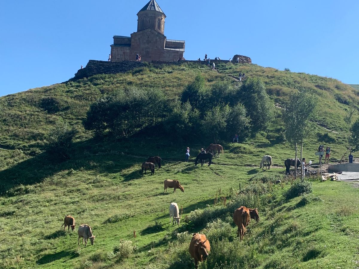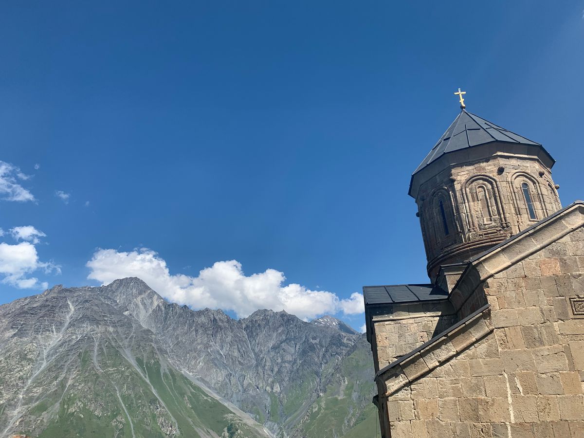5000m級のカズベキ山を背景に建つ、派手さの一切ない石づくりの厳かな教会。この尊い場所から人々を見守っていると感じ深く感動しました。