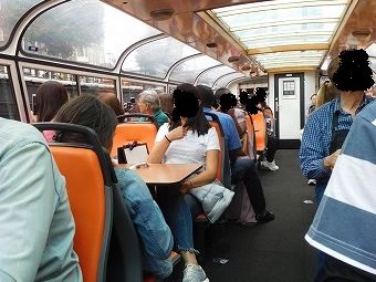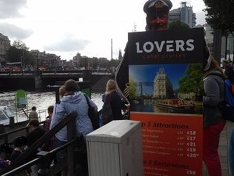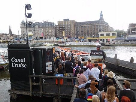 チケット交換の場所は案内にある通り、アムステルダム中央駅から歩いてすぐのところにあり土産物店などが並んでいる通りにありました。チケットを交換してもらった際、乗り場案内地図ももらい簡単な説明がありました。地図はカラーでわかりやすいです。あと、ここにはトイレもあり利用者は無料で使うことができるのが良かったです。クルーズ乗り場へは18時半頃(月曜)着いたのですが行列ができていました。最後に乗ったため、あいている席を探して座りましたが、窓際や好きな席を選びたい場合は次の便にしたほうがいいと思いました。私達の前にいたグループは実際、そうしていました。最後尾は外の風を受けることができるので天気が良い時はきもちが良いと思います。イヤホンが配られます。案内には日本語があるので説明を聞くことができました。さらに船長も時々英語で説明してくれました。1時間、のんびりと景色を眺めながらオランダの街並を楽しむことができたので良かったです。船内の一番後ろにトイレがありました。クルーズを終えて乗り場に戻ってきたのが20時頃で、待っている人の列は短かったです。