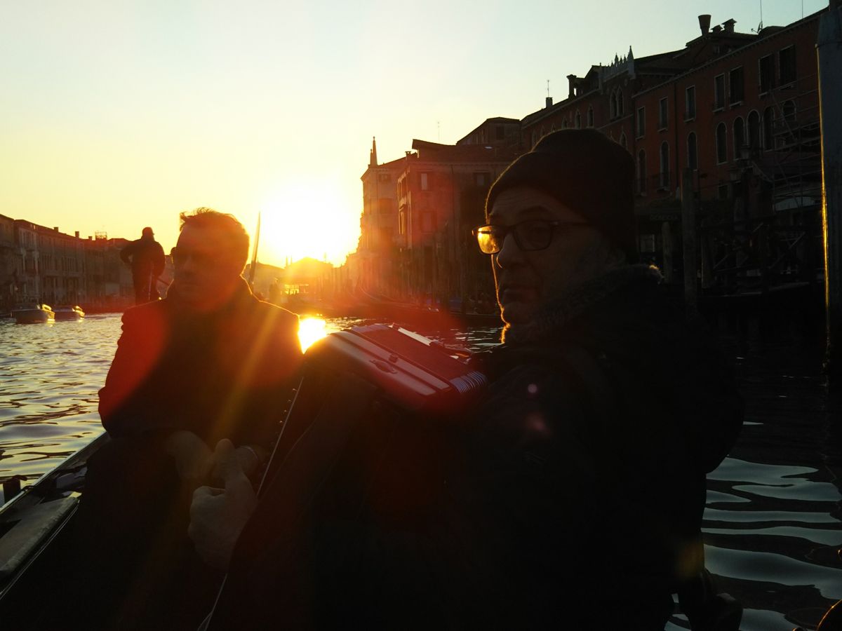 ゴンドラ出発地へ行くと、7組ほどの遊覧客がいました。舟の親方に予約表を見せると最後の出発船まで待ての指示があり乗船すると、二人組のおっさんが同乗してきた。出立し水路を一つ曲がるとその二人が歌手とアコーディオン伴奏者である事がすぐに判る。頃合いも良く、時を知らせる鐘の音が響き始めフンイキ抜群となり、セレナーデ生演奏が始まった。両脇の建物に挟まれた水路にくると歌い、その声は我が腹に響く心地よい瞬間でした。数曲の出し物でしたが、唯一サンタルチアのみが親しみがあった。狭い水路から広いところにでると、今度は真っ赤な夕日を背に何やら歌い、最高のプレゼンでした。惜しむ無くば、おやじ二人占有の珍道中であった。
