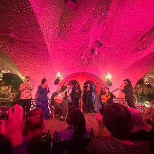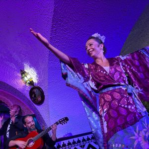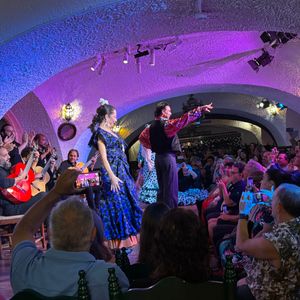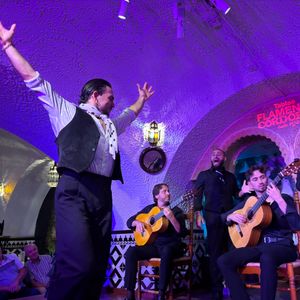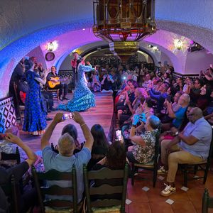 フラメンコは初めて直接見ました。とても素敵でした。一時間ほどで終わるのかと思っていましたが二時間弱あり見応え十分でした。フラメンコ前の食事は美味しい料理もありましたがテーブルの席と席の間が狭く満席だったのと時間が短く慌ただしかったのが残念でした。