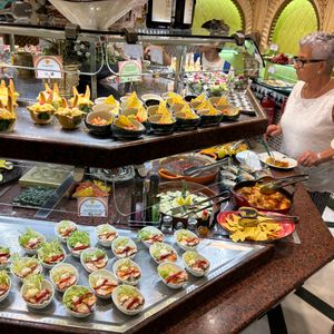 食事をまず食べてからショーを見る流れでしたが、会場が隣なので、食事中も会場内の歓声が聞こえてくるほどでした。ブッフェスタイルの食事は内容も豊富、ドリンクも制限なく、街中で見てきたタパス等もありました。