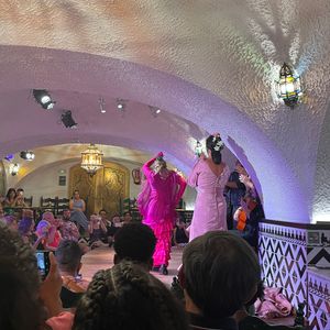天井が低くて部屋も狭く、密閉空間でステージを囲んで座る座席配置なので迫力満点。マスクを付けている人はいないのと、席は前後左右詰めて座るのでコロナ感染を気にする方にはおすすめしない。席が狭くて店員さんが通れないので、ドリンクは端の席の人からバケツリレーのようにして渡される。開始時間ギリギリに到着したからか、ドリンクはサングリアのみだった。また、席はステージ横側の後ろの方だったので、もしかしたら早く行けば前側から観れたかもしれない。フラメンコ自体は満足です。