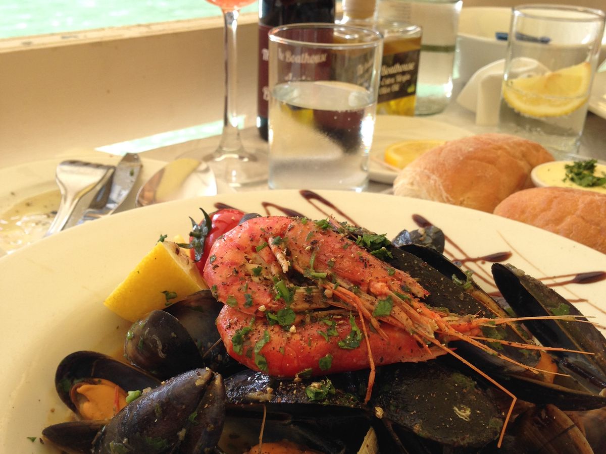 海辺のリゾートのレストラン「THE BOAT HOUSE」でランチタイム。テラス席のすぐ横が海で、パンを投げ入れると大量の魚(ボラ?)がパンに群がってきます。面白くて何度もやってしまいました。新鮮で美味しいシーフード料理とキリッと冷えたロゼワインで、贅沢なランチを楽しみました。最高!!