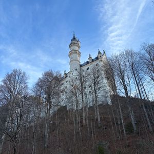 ノイシュバンシュタイン城**は、晴れた空の下、雪化粧と相まって、まるで絵画のような幻想的な美しさでした。