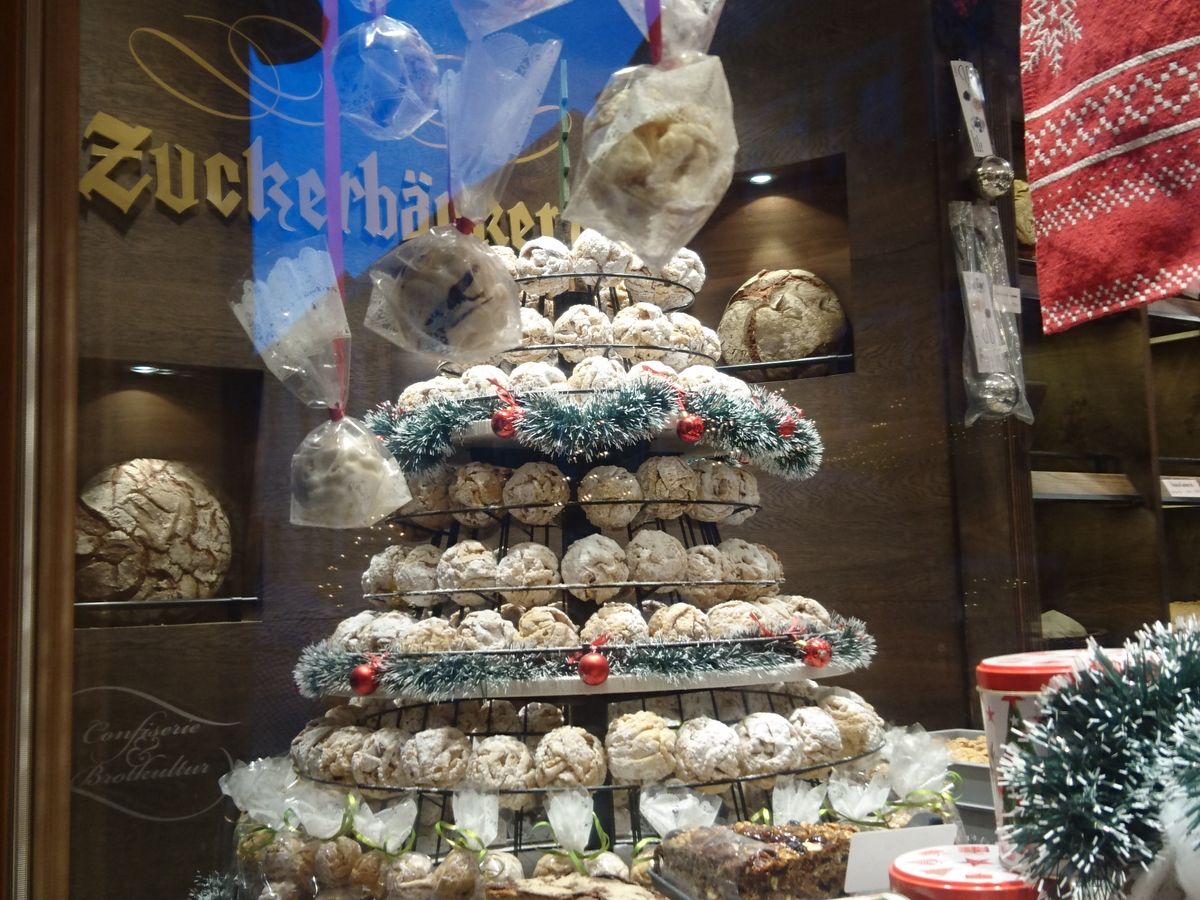 ローテンブルグへはトイレ休憩なしで、こちらに着いた頃にはかなりの雨が降っていたのでマーケットを手早く見てKǎthe Wohlfahrtの本店をじっくり鑑賞しながら雨宿りもできました(さすがに本店は混んでいて入るのに並びました)。シュネーバレンは名物らしくどこのお菓子屋さんでもアピールするようにショーウィンドウに飾ってあり、中にはクリスマスツリーのように並べてあったりしてとても素敵でした。お菓子屋さんで売っているせいか逆に私はマーケットで探すことはできませんでしたが、2時間強も自由時間があったのでのんびりお菓子屋さんで座ってシュネーバレンをいただくことができました。