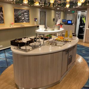 到着まで、ビールとワイン(1種類ずつ。棚に入っているものは有料)、フリードリンク、軽食がビュッフェ形式で提供されます。