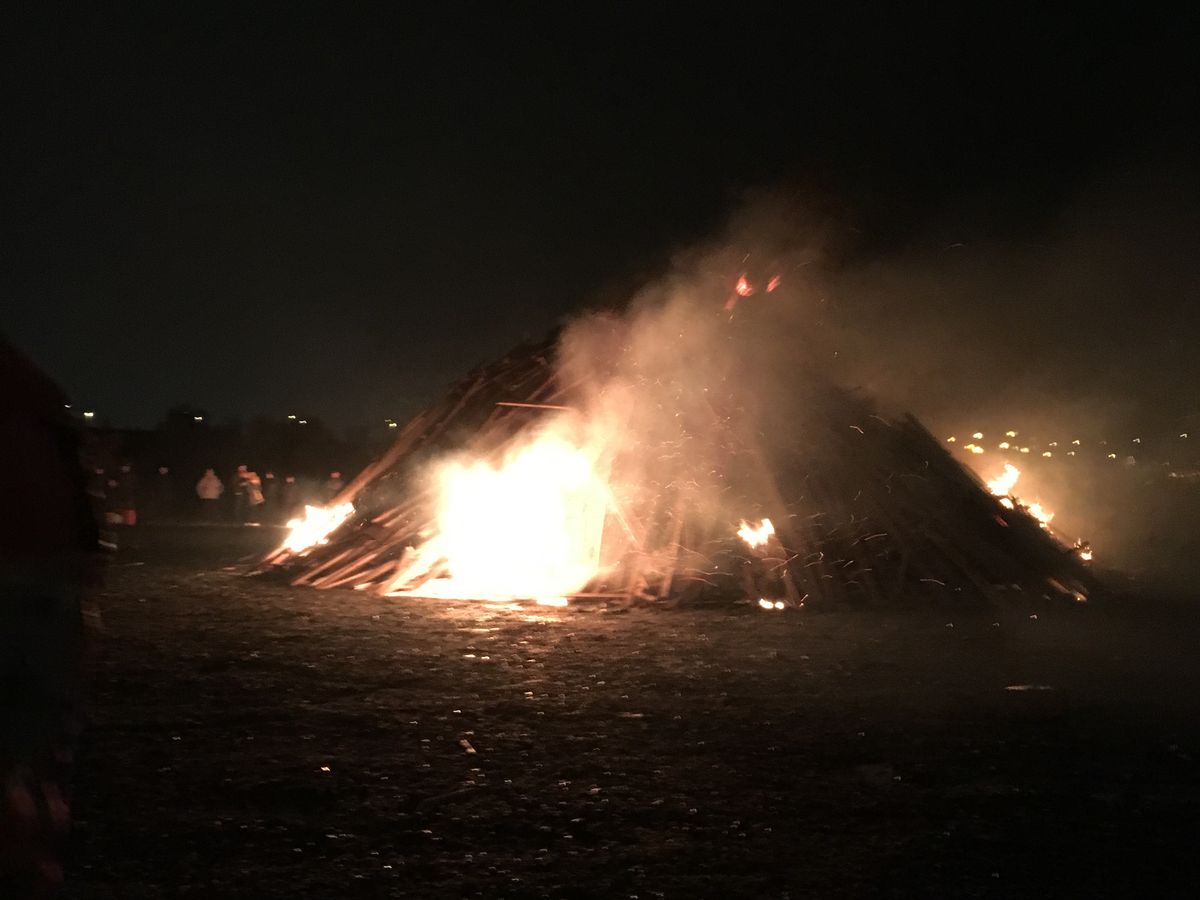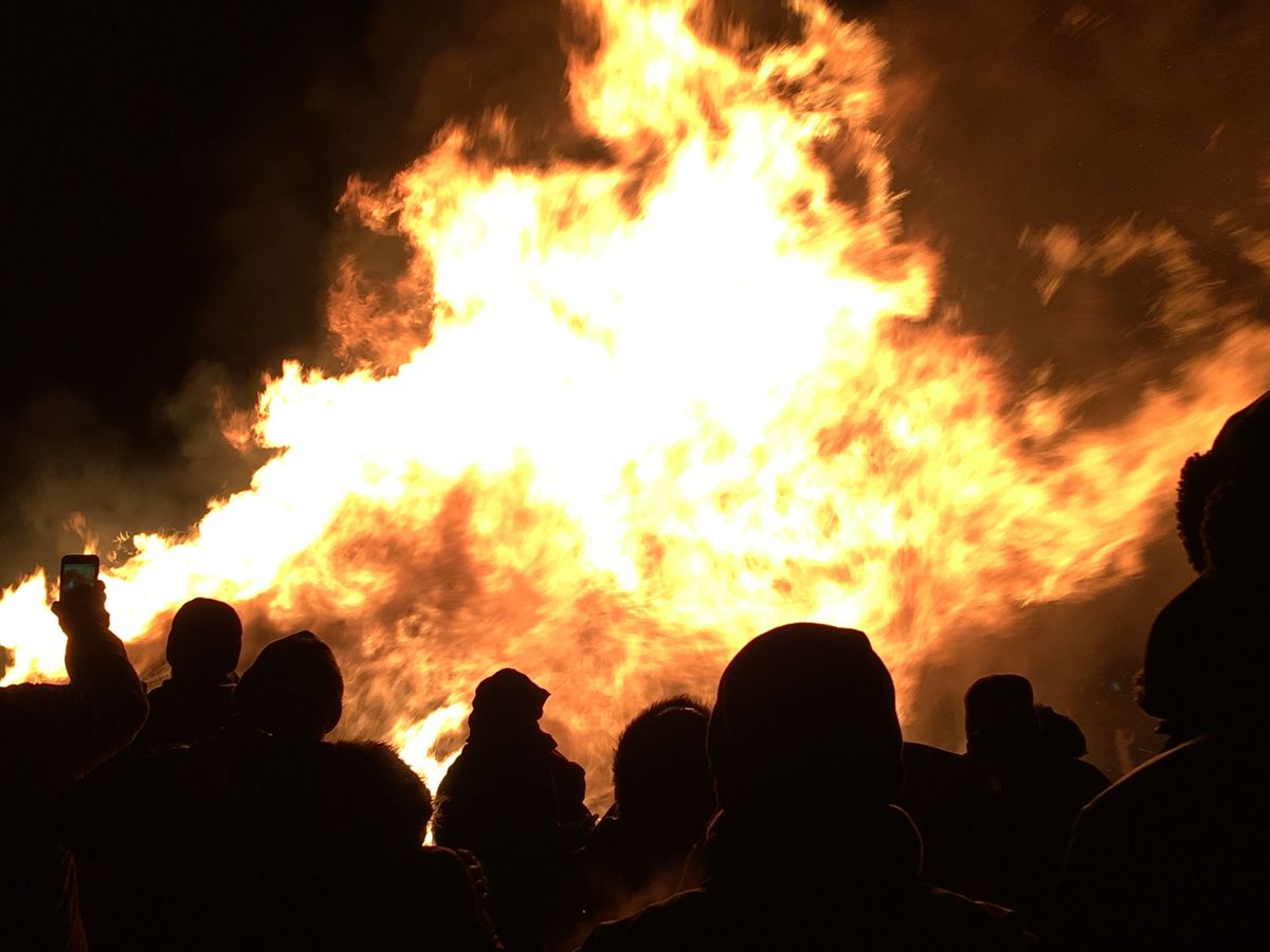 英語の喋れない私は皆さんが解散後、ガイドさんを捕まえてマンツーマンで説明を受けました(ガイドさんありがとう)私が理解した内容は、バスの番号、このバスに2時間後集合。それまで、かがり火とトイレとコーヒー(建物あり)。単語をひろってそれだけ分かりましたが、2時間もどうすんの?!というのが私のその時の気持ちでした。それからかがり火を見に行き、前の方で見れました。やっぱお焚き火ねぇ、うーんもう引き返す?でも周りの人誰も動かないねぇって思ってたら、かがり火がどんどん変化、すごい!!炎が生きてます!!怖くてどんどん後退しました。その炎が落ち着いてきた頃カウントダウンが聴こえて、何、何?って思ってとら、炎と反対方向から花火が上がりました!これも良かったです。