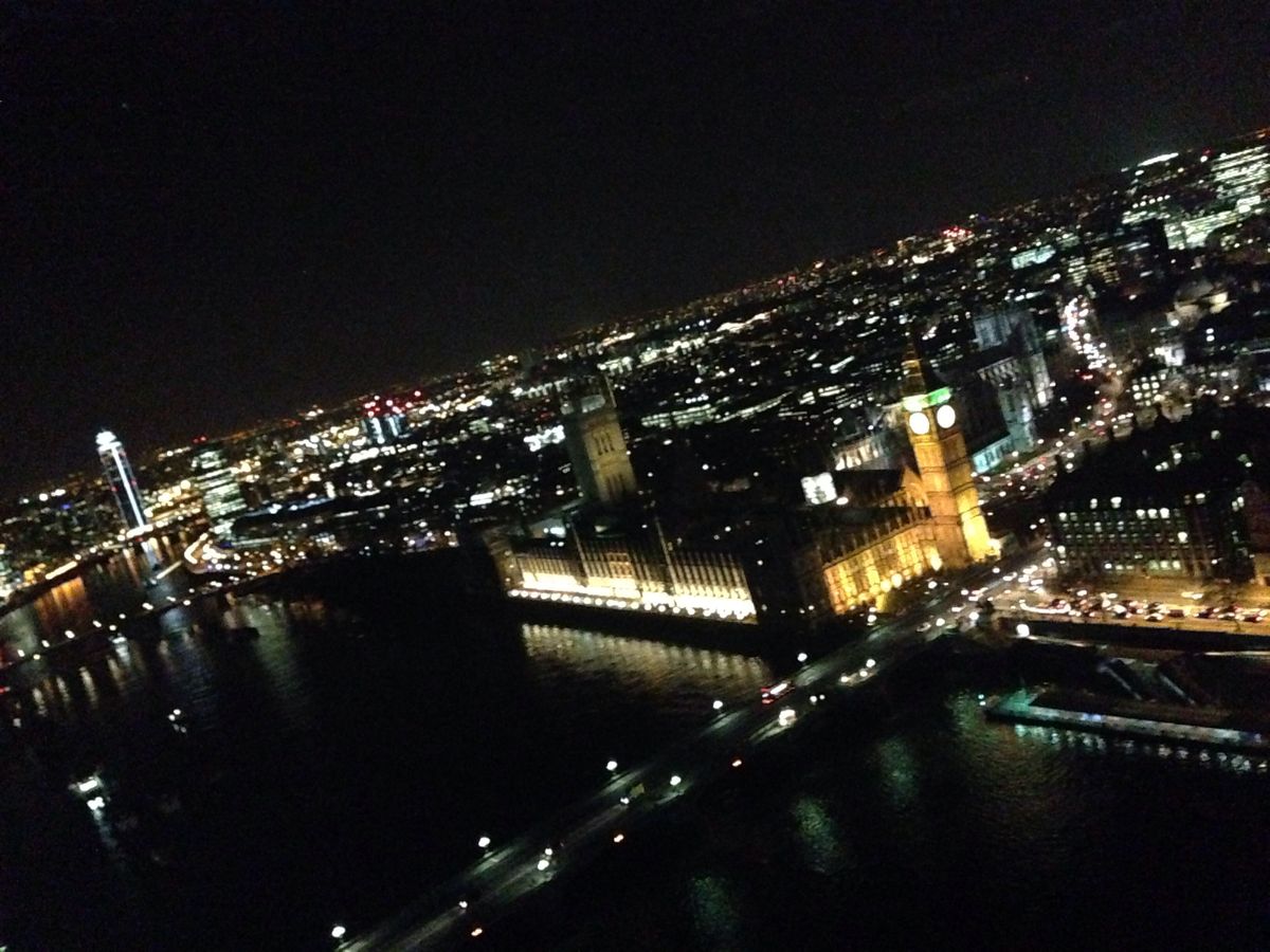 日本の観覧車とは違い、一つの乗り物に20人位乗るのですが、写真を撮ってもらえたりしました。街中を歩きながら見るロンドンの夜景だけでなく、街を上から見下ろす夜景もきれいでした!