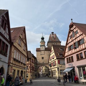 ツアー集合場所から8時頃バスに乗り込み、2時間半ほどでローテンブルク・オプ・デア・タウバー旧市街の城壁前に到着。トイレ休憩を挟み城壁にある入り口より旧市街に入ると、そこには石畳と可愛らしい街並みが広がっていました。路地を覗くと、奥に先ほど入って来た街を囲う城壁を垣間見ることができ、現代の街ではそう見ることのできない中世の景色がそこにありました。