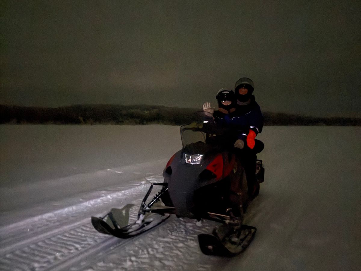 2日目はさらに天候が曇りになり、どんより立ち込めた雲の奥の方がぼんやり緑色に光るのを見ただけ。でも広い氷湖の上で初めてスノーモービルを運転させてもらえて、アクティビティとしては大満足でした。