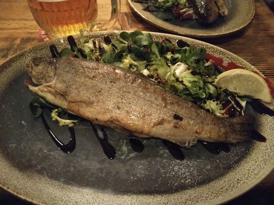 -チェスキークルムロフ名物マス料理1メイン & チェコのバドワイザーのビール1杯付き♪