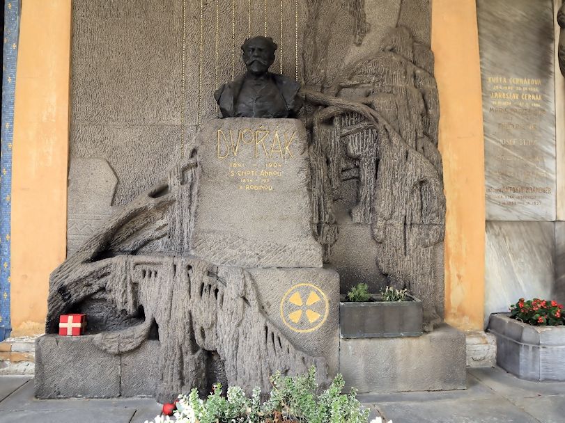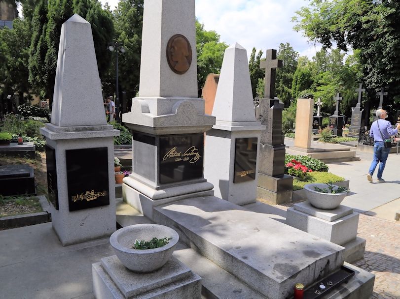 スケジュールにはトラムで、とありましたが、我々は地下鉄でヴィシェフラードへ移動。聖ペトロ・パウロ教会などを見つつ民族墓地へ。以前プラハを訪れたときはここまで足を伸ばせなかったのですが、音楽好きの私としては作曲家のスメタナやドヴォルザーク、大指揮者のラファエル・クーベリック(父で作曲家・ヴァイオリニストのヤン・クーベリックや画家のアルフォンス・ミャシャと合葬されている)のお墓に詣でたいとかねてから考えていたので、ガイドさんに案内していただくとお目当てのお墓を捜し求める手間が省けて大変助かりました。ヴルタヴァ河畔に降りて市電でホテル近くの停留所まで送っていただきツアー終了。