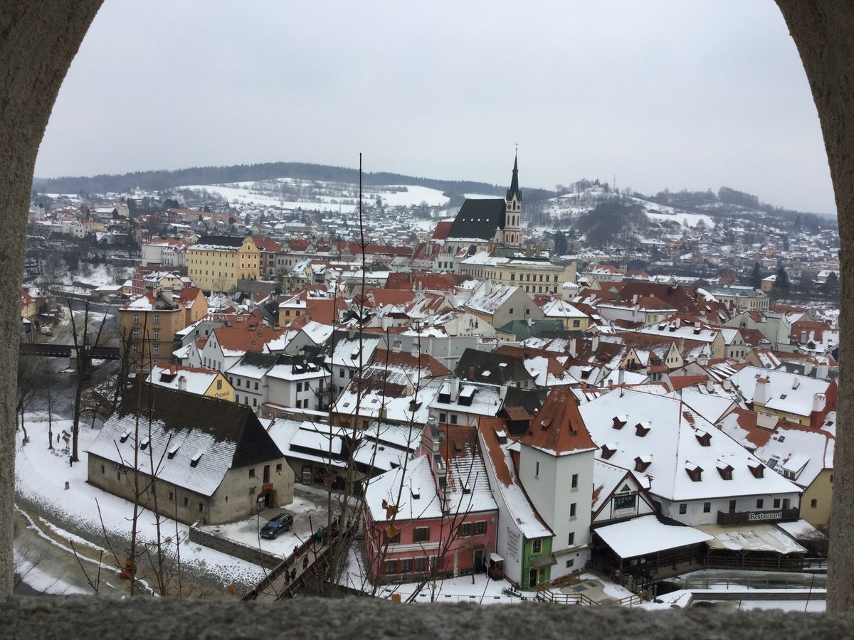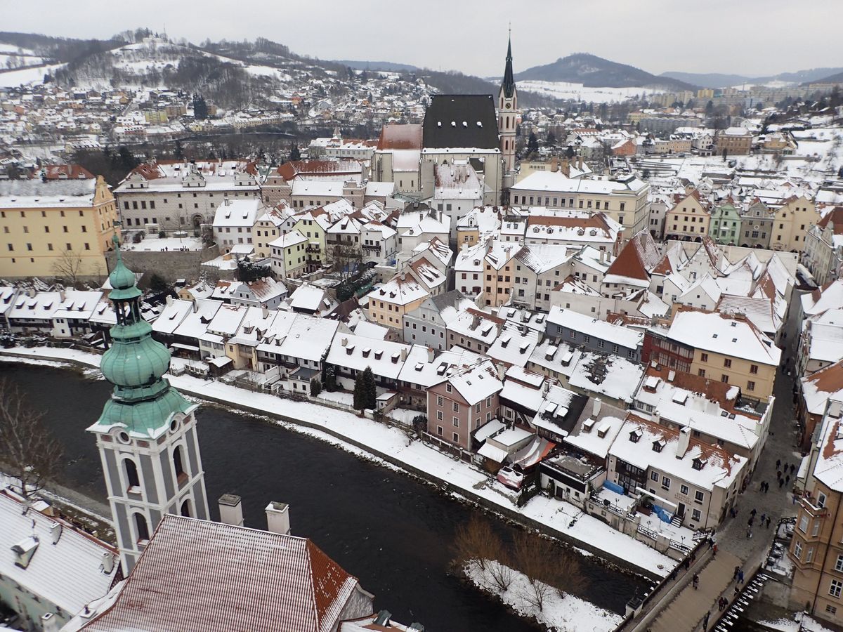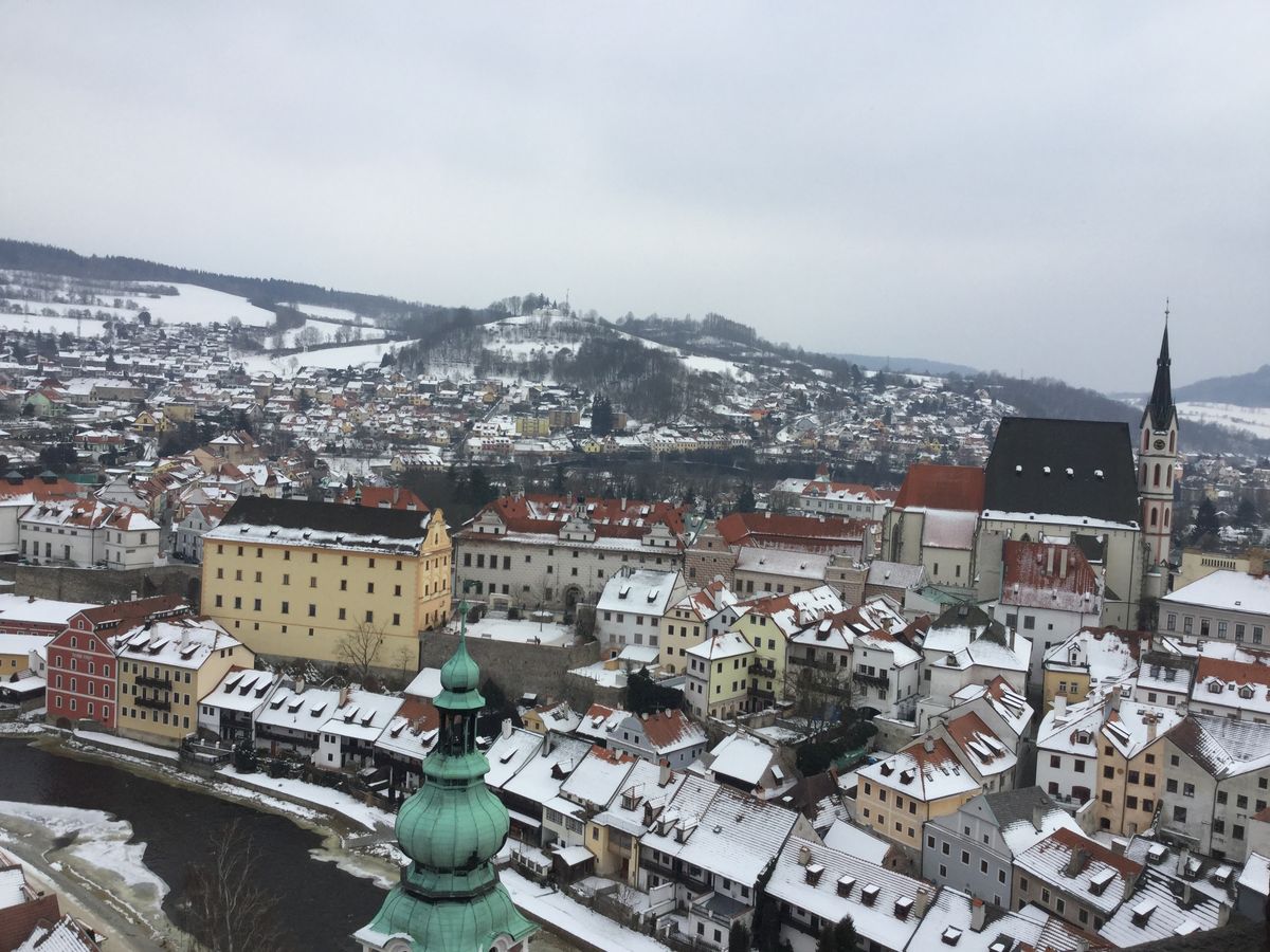チェスキークルムロフの街並みはうっすらとし雪景色で美しかったです。夏の風景とは違う風情がありました。塔の上まで上がりましたが,風が冷たく寒かったです。ここの展示室の調度品は見応えがありました。