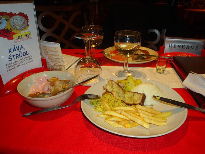 アコーディオンの生演奏があり、食事料理はバイキング形式。 チェコ料理らしい肉料理。飲み物は有料でワインまたはチェコビールを飲んで食べながら見学。食後は2階のデッキに上がって見学。