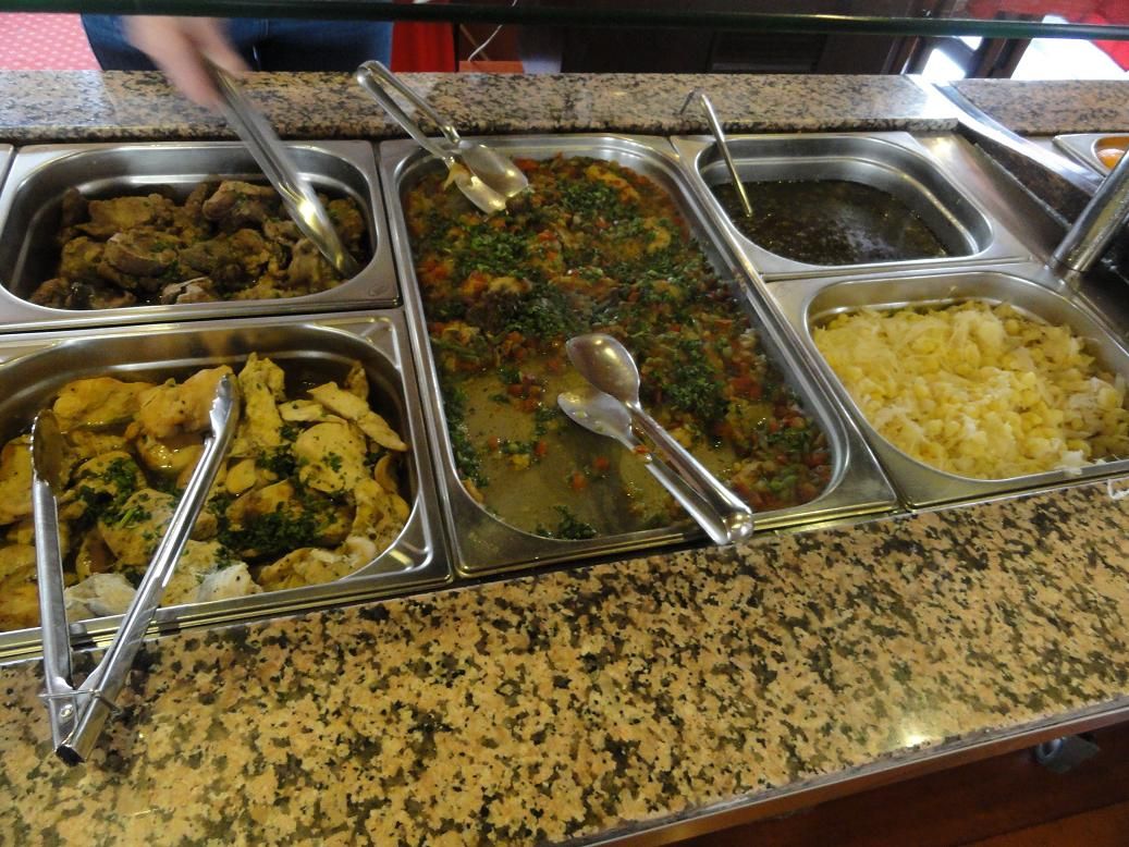 食事はバイキング方式、肉料理、野菜料理、果物、ケーキがたんとあります。