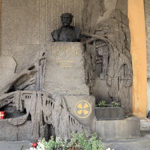 スケジュールにはトラムで、とありましたが、我々は地下鉄でヴィシェフラードへ移動。聖ペトロ・パウロ教会などを見つつ民族墓地へ。以前プラハを訪れたときはここまで足を伸ばせなかったのですが、音楽好きの私としては作曲家のスメタナやドヴォルザーク、大指揮者のラファエル・クーベリック(父で作曲家・ヴァイオリニストのヤン・クーベリックや画家のアルフォンス・ミャシャと合葬されている)のお墓に詣でたいとかねてから考えていたので、ガイドさんに案内していただくとお目当てのお墓を捜し求める手間が省けて大変助かりました。ヴルタヴァ河畔に降りて市電でホテル近くの停留所まで送っていただきツアー終了。