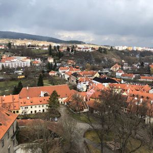 集合時間ちょうどにホテルのロビーに降りていくと、わざわざ名前を書いた紙を持って待っていていただきました。ホテルから1時間15分ほどでターボルの街に到着して観光しますが、別料金で教会の尖塔にも上がることができ、街並みを俯瞰することができました…