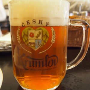 9時過ぎに出発して約1時間半、Pisekで一回休憩を入れて、11時半に最初の目的地ブディェヨヴィッツのオタカル広場を見学、さらにチェスキー・クルムロフまで移動するとちょうどお昼の12時半に到着。エッゲンベルク(Eggenberg)という地ビール工場直営のレストランで昼食を取り、ここが観光後の集合地点。昼食はチェコの郷土料理の中から、ガイドのお勧めを車内で選択でき予約してもらうシステム、①グラーシュ②シュニッチェル③ローストポーク④チーズのフライから私は一番のおすすめのチーズフライを選択。サクサクの衣ととろけるようなチーズのフライで、ピルスナー地ビールとぴったり。工場直営店ならではのおいしい生ビールをいただきました。