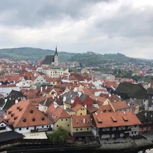 プラハ旧市街のホテルをチェックアウトし、迎えの車でチェスキー・クルムロフヘ。到着までずっと霧でした。ガイドさんは西荻窪や九州に住んでいたことがあるという焼き物や古い建物が好きなマルティンさん。到着後、晴天となり、チェスキー・クルムロフ城の城下町を散策しながら歴史を教えていただきました。城に登る前に昼食。マス料理、ビール、ケーキでお腹いっぱい。トルデルニーク付きとなっていましたが、付いて無いとのこと??でも、付いていても満腹で食べられなかったでしょう。城に登り町を眺めると、青空のもと赤い屋根の綺麗な町並みが広がりました。帰りは途中ガソリンスタンドで休憩し、別料金でしたがプラハ空港隣接のホテルまで送ってもらい、チェックイン手続き完了までいてくださいました。旅行の最終日を良い思い出で締めくくれました。