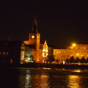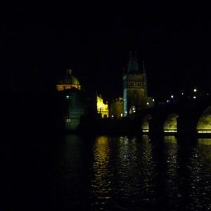 それから待つこと30分。別の小さな船がCecilに横付けした。ツアーの一同は乗り込んだが、怒って帰った客もいた。まあまあ、そこは多めに見てとばかり、別の船に乗り込んだ。ときあたかも漆黒の闇となり、ナイトクルーズには絶好。今度こそと思っていると、船はカレル橋の下を通り、運河を通って上流へ。どこかから音楽も聞こえる。ゆったりとした気持ちになり、3時間のクルーズを終え、元も川岸に戻った。