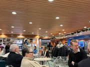 行きと同様にカウンターでeバウチャーとパスポート提示で乗船チケットとブュッフェチケット渡してくれます。 乗船後の食事会場入りが6時15分からなので、また入り口から並んで待ち、当日購入の列と2つに別れてるので、リザーブ側へ進みます。 席が空いていれば、当日券40€です。 席に着いてからもブュッフェですので、ダイニングにも並びが出来てます、、アルコールもデザートも食べ放題なのでしょう。隣の若い女子2人