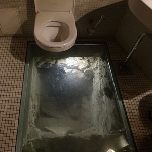 面白いのはトイレの床がガラス張りで地下に続く石畳が見られます。ちょっと暗いけど。