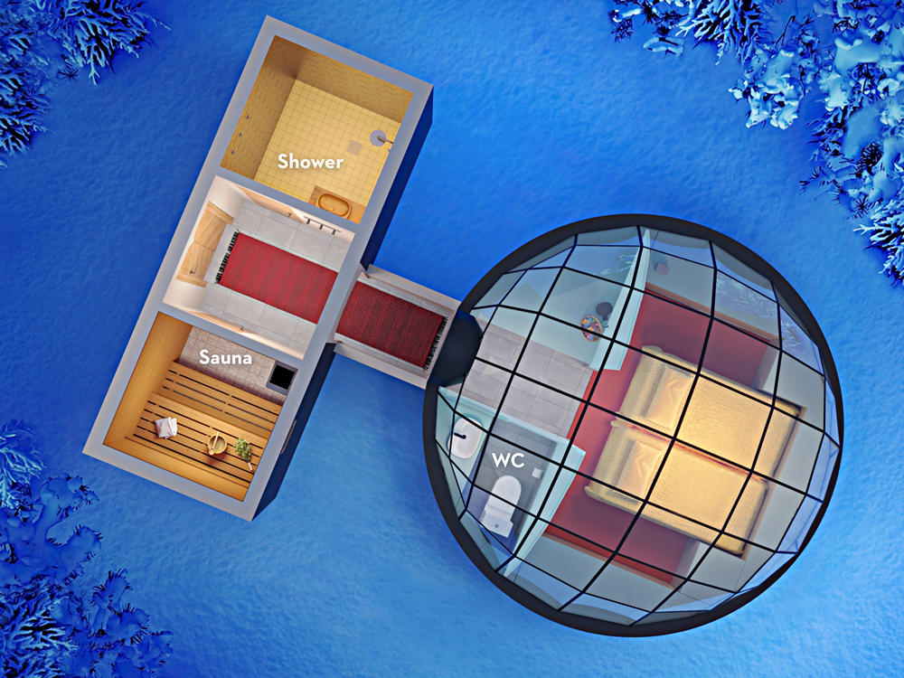 - ガラスイグルーのお部屋レイアウトはこちらをご確認ください。暖炉付きの広々としたプレミアム・ガラスイグルーへアップグレードもオプションより可能です。
