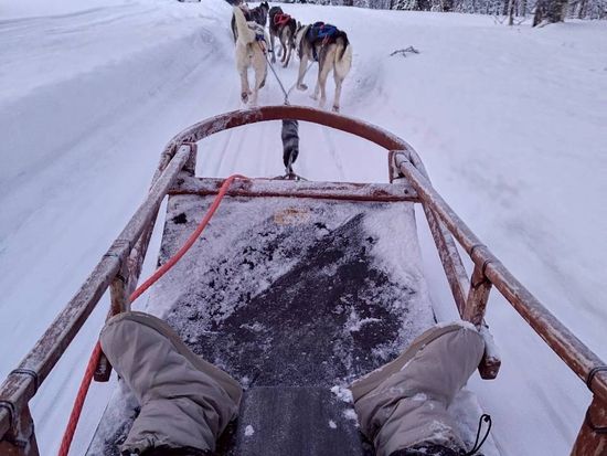 ※2人で犬ぞりに乗る場合は1人が運転手として犬ぞりの後ろに立ち、もう一人は犬ぞりに座ります。