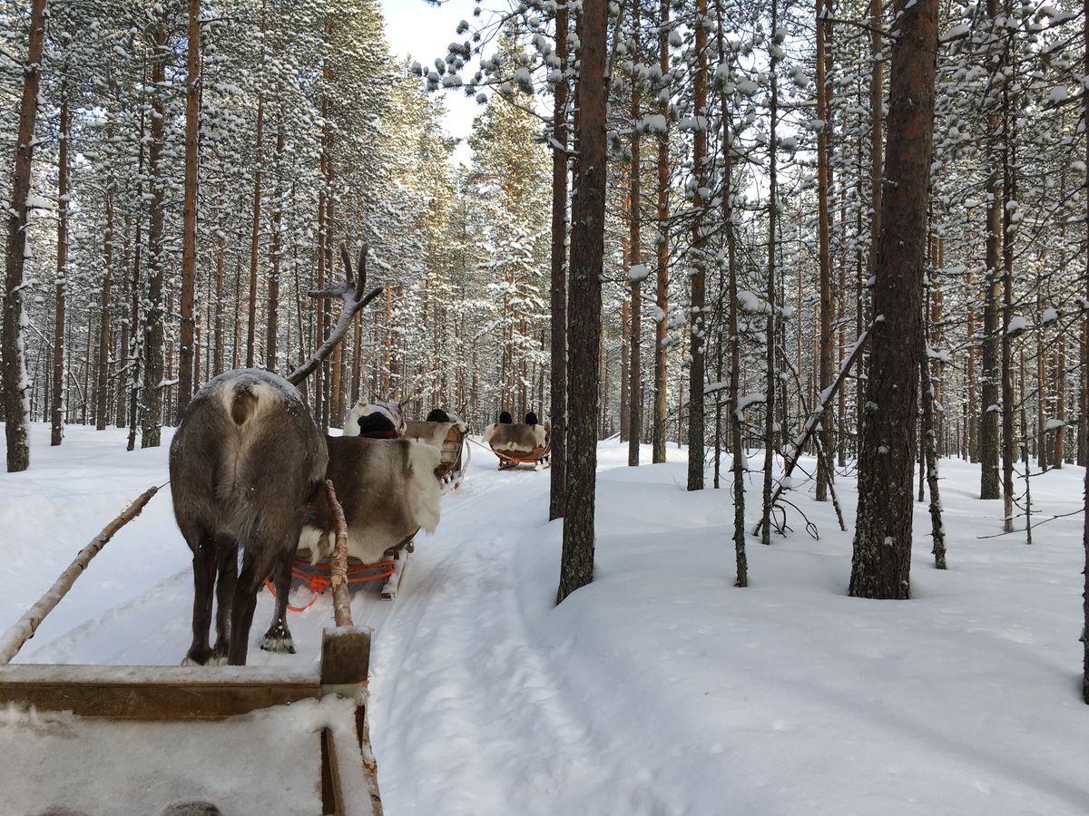 トナカイには触れませんが、とても近くで写真が撮れます。トナカイはのんびり屋さんで、時々止まったりしながら、ゆっくりサンタ村を目指します。途中の景色はとても幻想的でした。