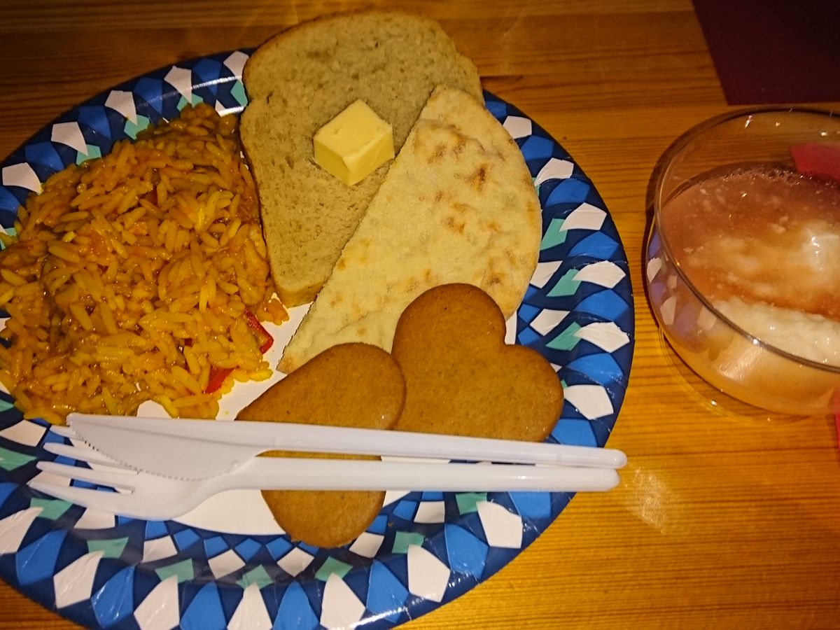 その後準備が整ったら昼食でした。ミートボールが美味しかったです。メニューはほかにパン、サラダ、マッシュポテト、クッキー、チョコドリンクなどがあったと思います。